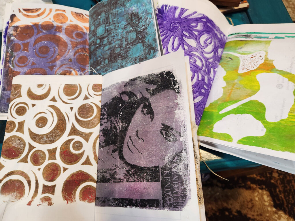 Learn the basics of gelli printing using stencils and stamps. A gelli print class teaches the monoprinting process using a gelatin-like plate, allowing students to create unique, one-of-a-kind prints without a press. Warning: making gelli prints is addicting! It’s hard to stop. Adults only. No previous experience required.
